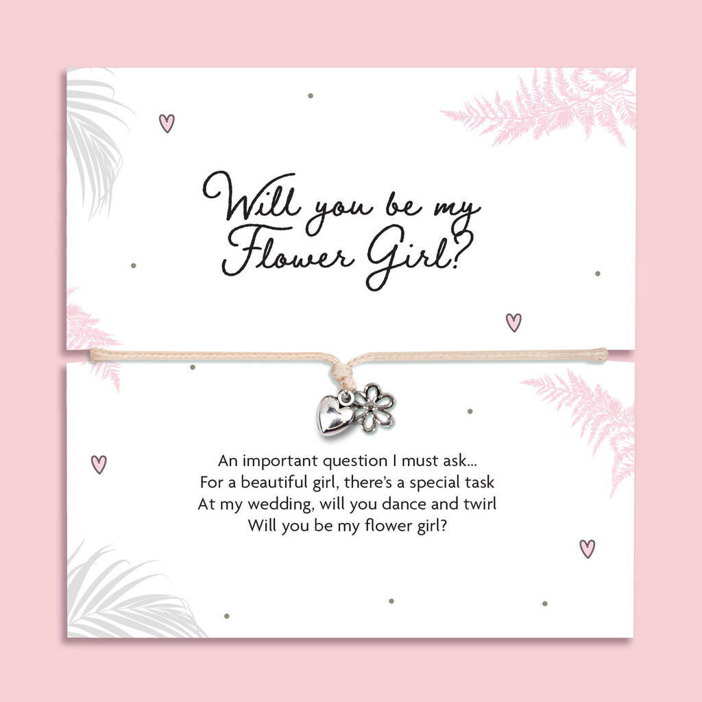 Mounted on an elegant illustrated card reading “Will you be my Flower Girl?” and finished with a lovely poem, this bracelet makes a thoughtful and memorable proposal gift she can treasure long after the wedding.