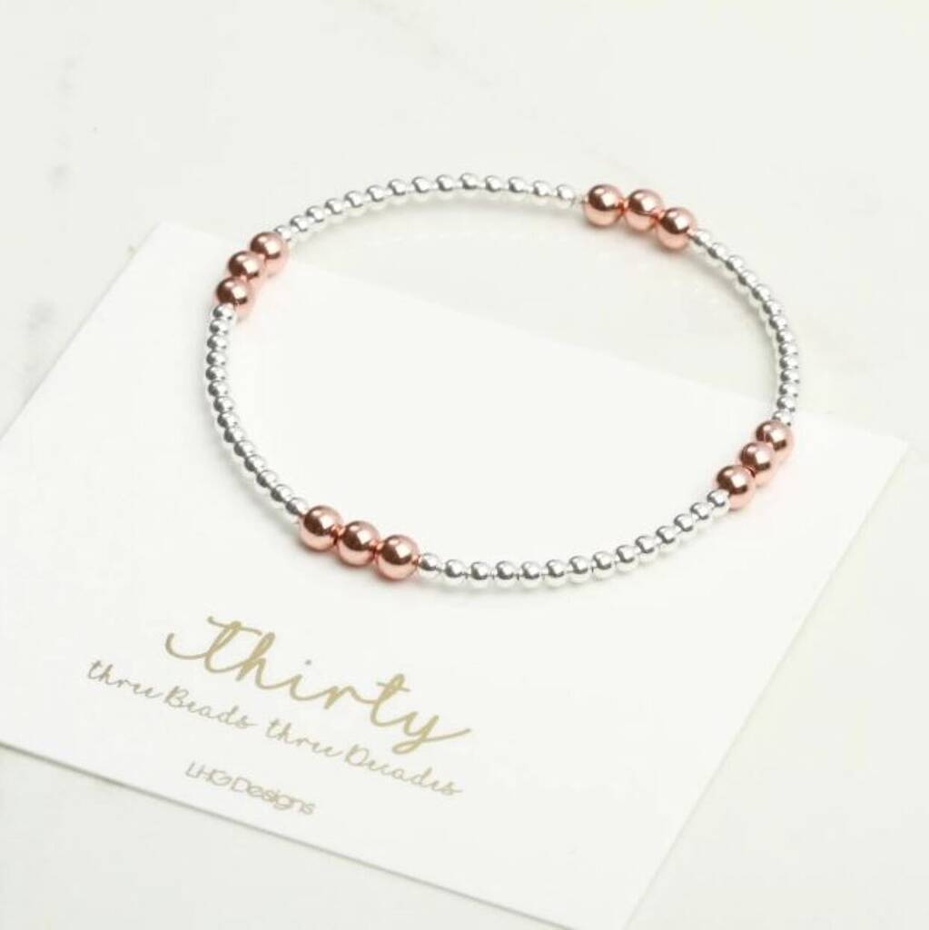 The bracelet is made with 2.5 mm silver beads, the 4mm accent beads represent a decade each (50). What's more this lovely 5 bead pattern is repeated around the bracelet to make sure it doesn't get hidden.
