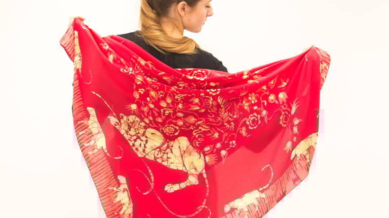 With Batik every piece is unique, as the dyes are effected by sunlight and the wax will always crack in different formations. Therefore, to create a limited edition collection for each design she's been working in England with a printer who has had her designs scanned and recreated with great integrity onto Silk.
