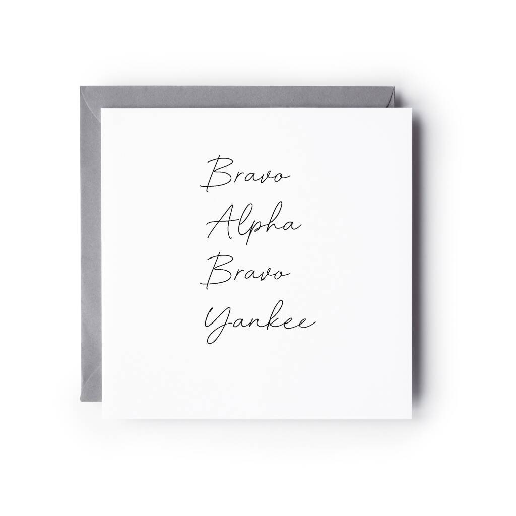 Welcome a little one in a unique and memorable way with our “BABY – Bravo Alpha Bravo Yankee” greeting card. Featuring the word BABY written in phonetic alphabet style, this design adds a clever and contemporary twist to a classic baby card.