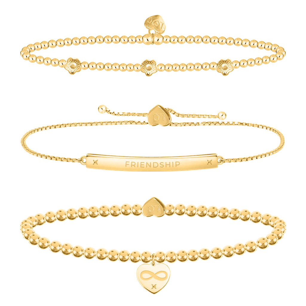 Inside this beautiful box, you’ll find 3 stunning gold plated bracelets:– one bangle bracelet adjustable for a comfortable, flexible fit and engraved with the heartfelt sentiment “Friendship”– 3 mm delicate beaded bracelet adorned with charming gold flowers accents. – 5 mm beaded bracelet featuring gold heart details for showing your love for your friendship.