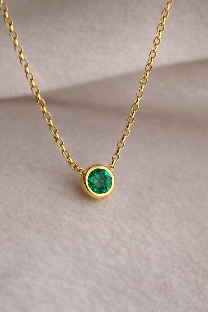 This delicate 9k solid gold necklace features a single round brilliant emerald set in a bezel mount, suspended on a fine gold chain.