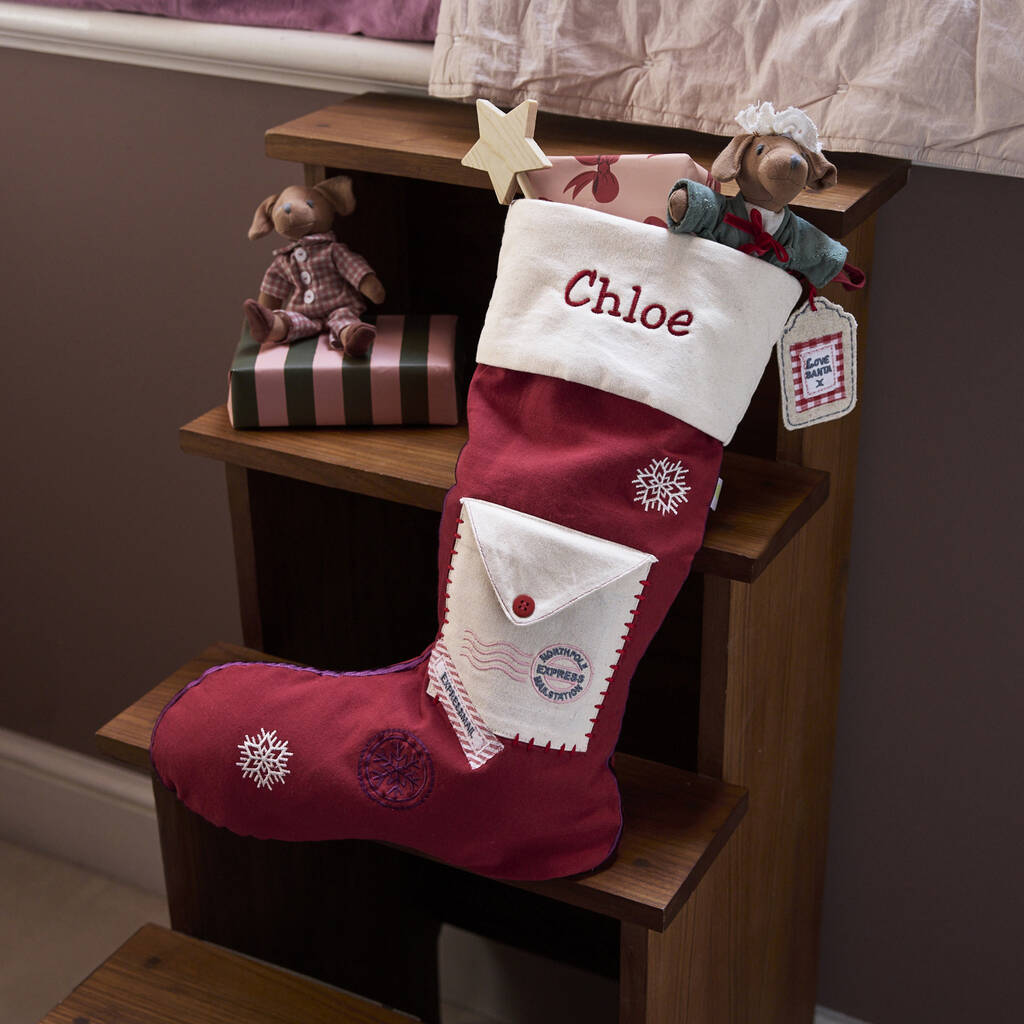 A gorgeous Christmas stocking with a lovely fabric envelope to put a letter to Santa in and a free embroidered personalised name.