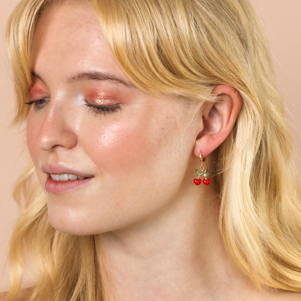 Made of 14ct gold plated brass, these pretty earrings are perfect for adding to a fun everyday jewellery collection. Featuring delightful dangling cherry charms made from colourful enamel, these tiny huggies are small and lightweight enough for all-day wear.