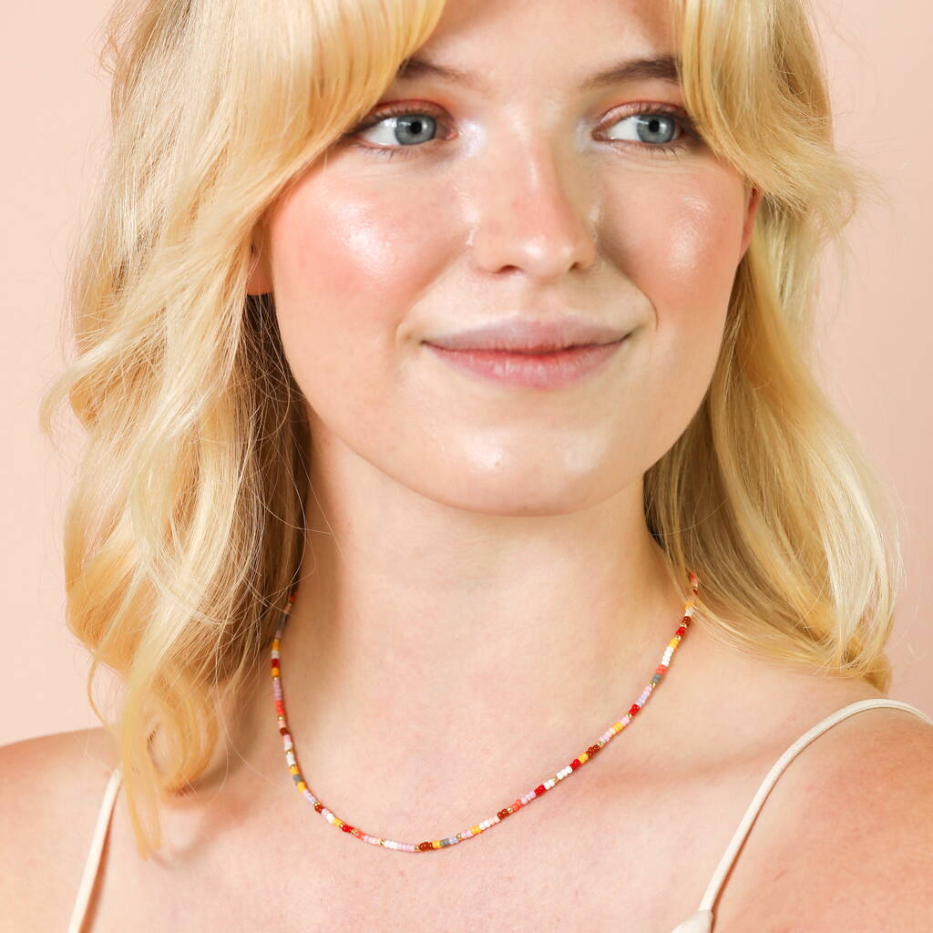 A playful beaded necklace made up of pretty pink, yellow, orange, and red beads.
