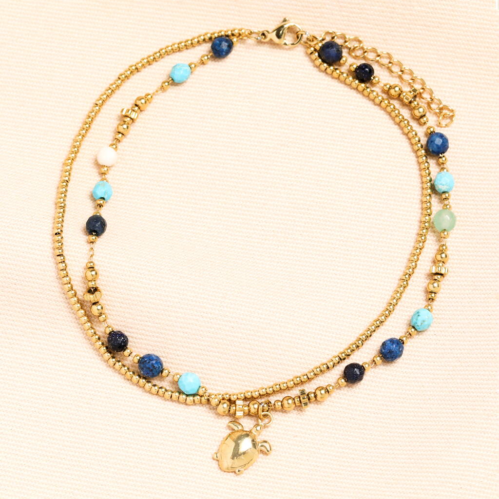 Semi Precious Beaded Blue Turtle Anklet In Gold