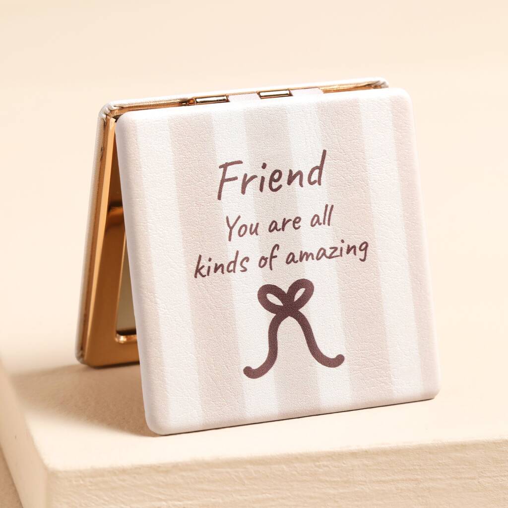 Lightweight enough for carrying in your bag or pocket day-to-day, this pretty mirror is perfect for gifting to a friend. With text that reads 'Friend you are all kinds of amazing', this compact is complete with one regular and one magnified mirror.