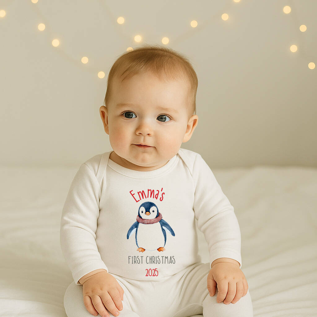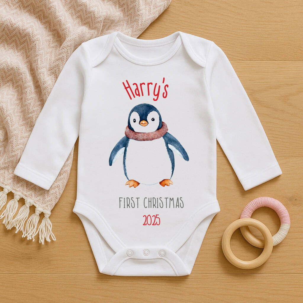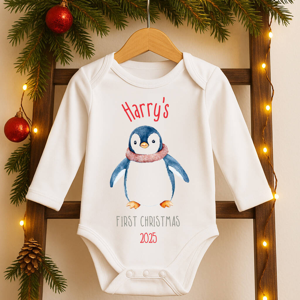 Personalised Baby's First Christmas Babygrow / Bodysuit Christmas Penguin