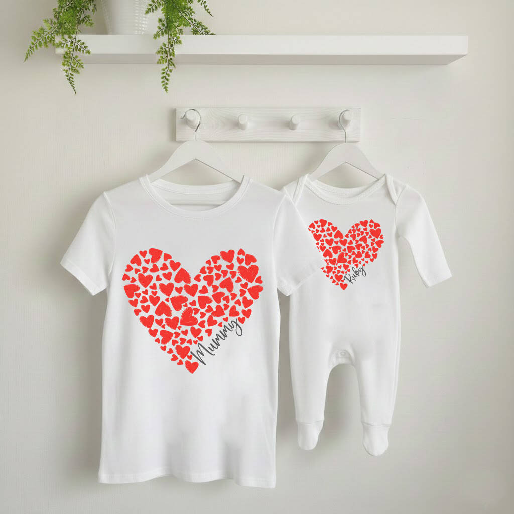 Personalised First Mother's Day Mummy And Me Matching T Shirt And Babygrow Set Hearts