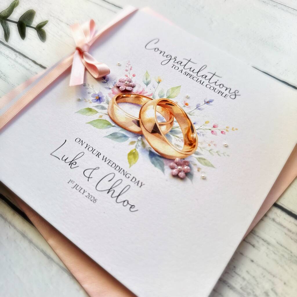 Celebrate their union with our pretty personalised wedding card. Customised with the couple's names and wedding date. The simple design is perfect for sending your congratulations and best wishes for the future. A pretty design featuring wedding rings on a floral background is hand-finished with a touch of iridescent glitter, paper flowers, tiny pearls and a pink bow. Please visit my shop for other designs including a simplifie version of this card and a matching money envelope.