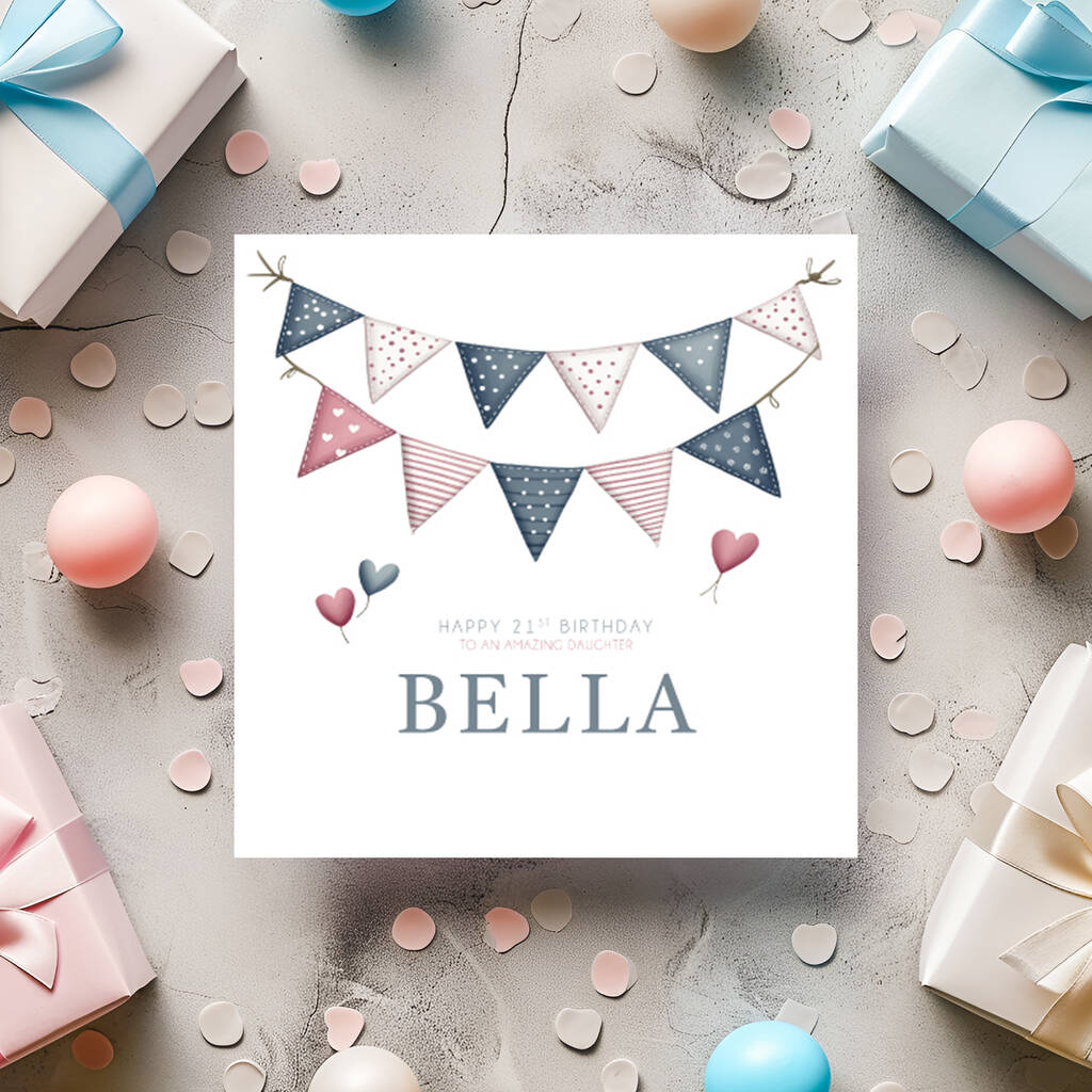 A modern card personalised with the birthday girls name and a pretty bunting graphic. Perfect for a special daughter, niece, granddaughter, or sister.