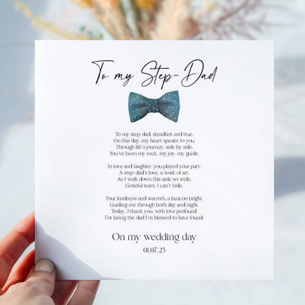 Celebrate a special step-dad on your wedding day.Celebrate your special day with a heartfelt message to your step-dad using our stunning yet simple wedding day card. This beautifully designed card is the perfect way to express your love and gratitude to your step-father on this momentous occasion.