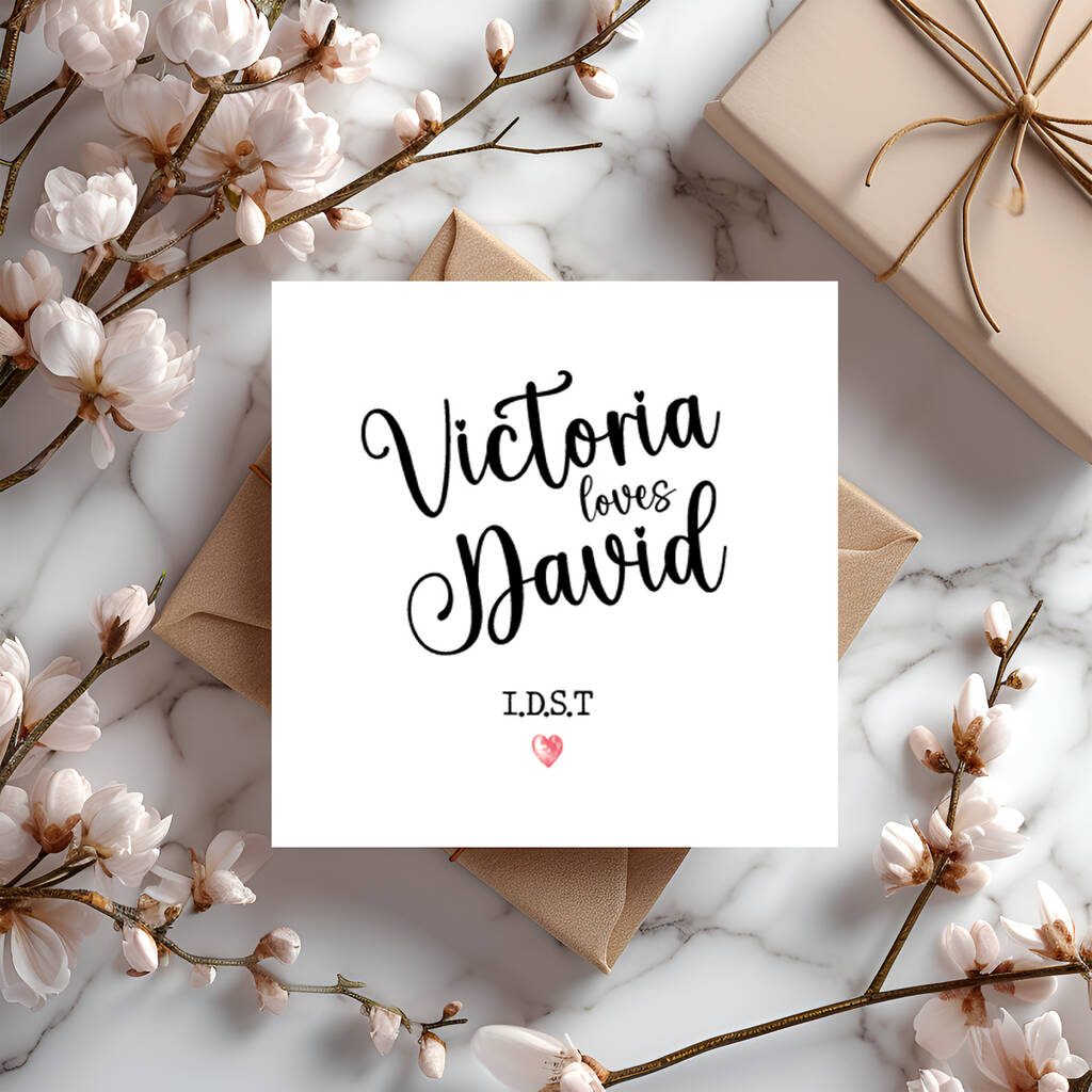 Celebrate Valentine's Day or an anniversary with this simple personalised card. Featuring the names of the loved up couple and the retro acronym "I.D.S.T" which stands for - If destroyed still true. Perfect for either a boyfriend, girlfriend, husband or wife.