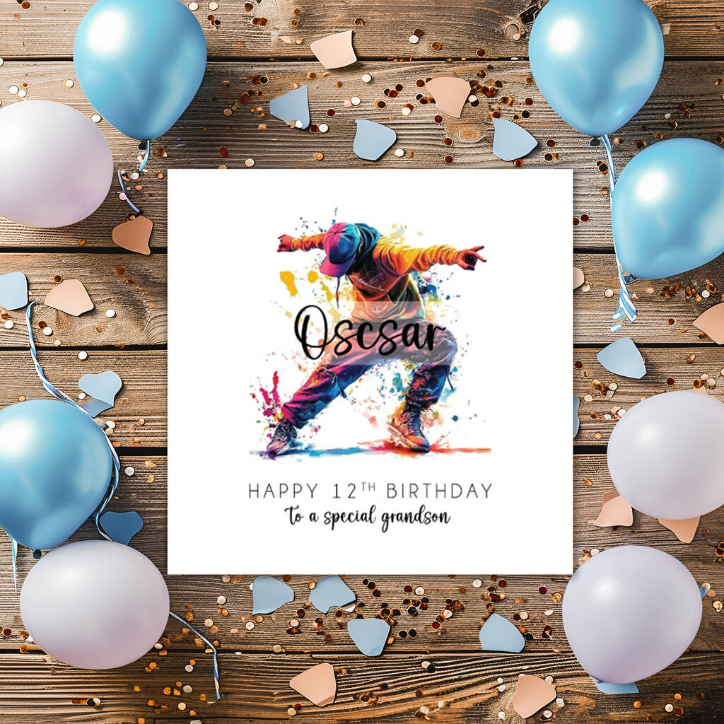 A funky street dance birthday card for a special son or Grandson. Personalised with his name and age.