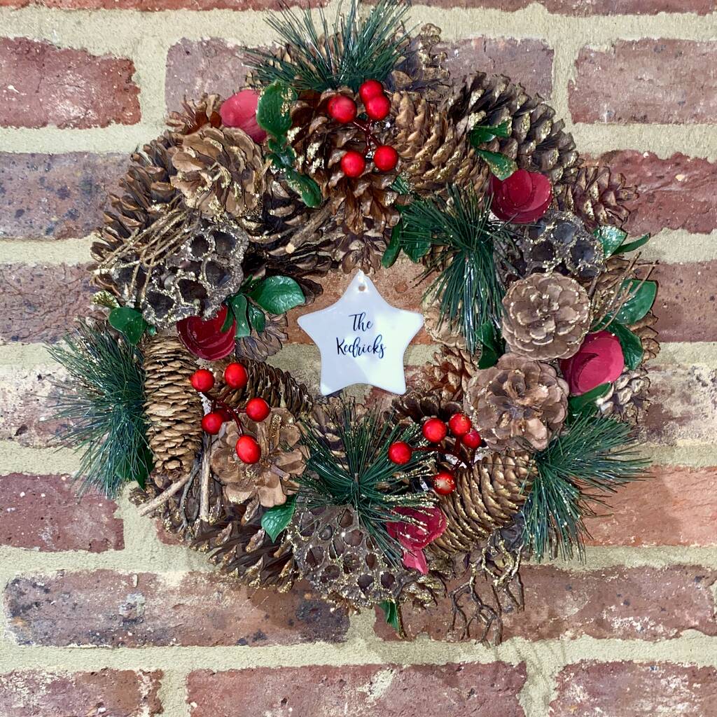Personalised Gold Glitter Pine And Red Berry Wreath