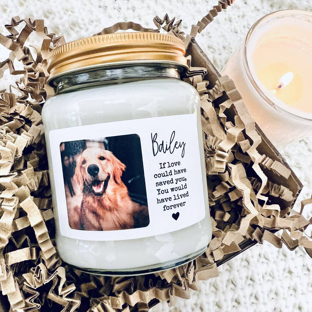 A touching personalised candle featuring your pet’s photo, name, and “if love could have saved you, you would have lived forever”