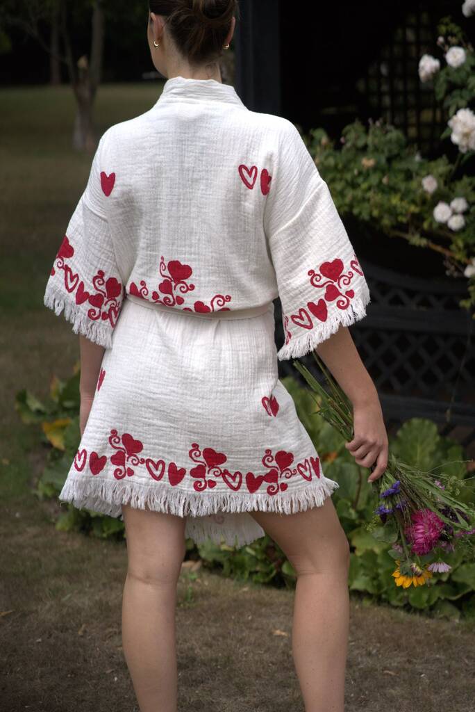 Organic Short Cotton Kimono: White With Hearts