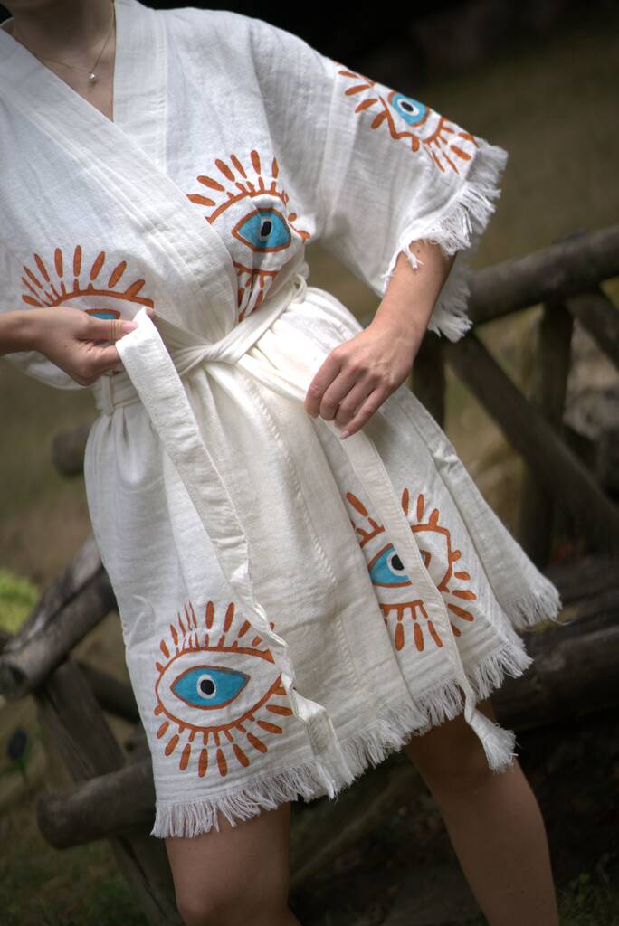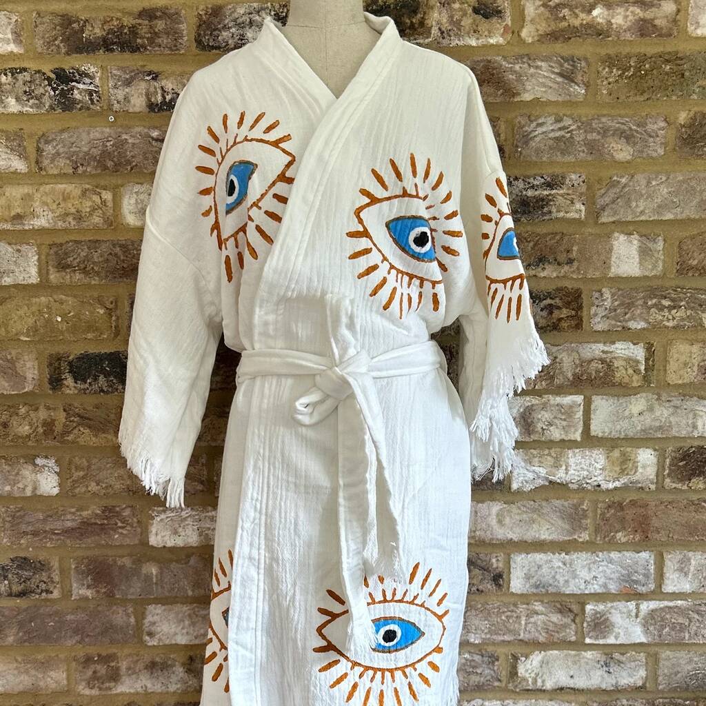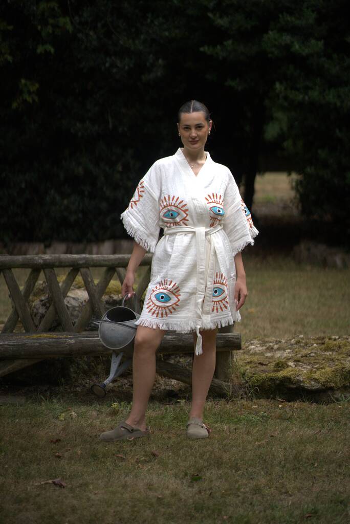 Organic Short Cotton Kimono: White With Orange And Blue Eye