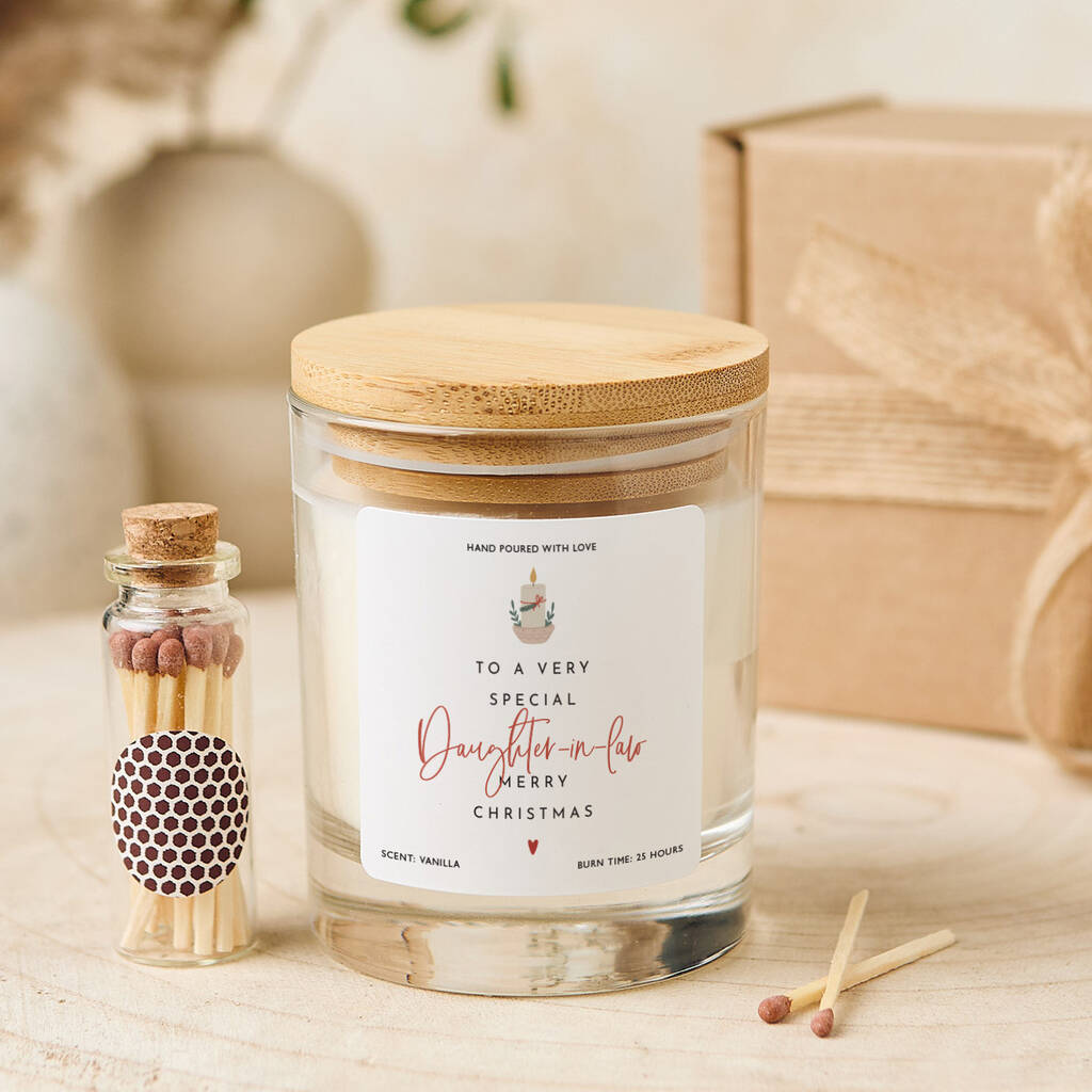 Christmas Gift for Daughter in Law Vegan Soy Wax Candle with Bamboo Lid Free Gift Package with Mini Matches Jar