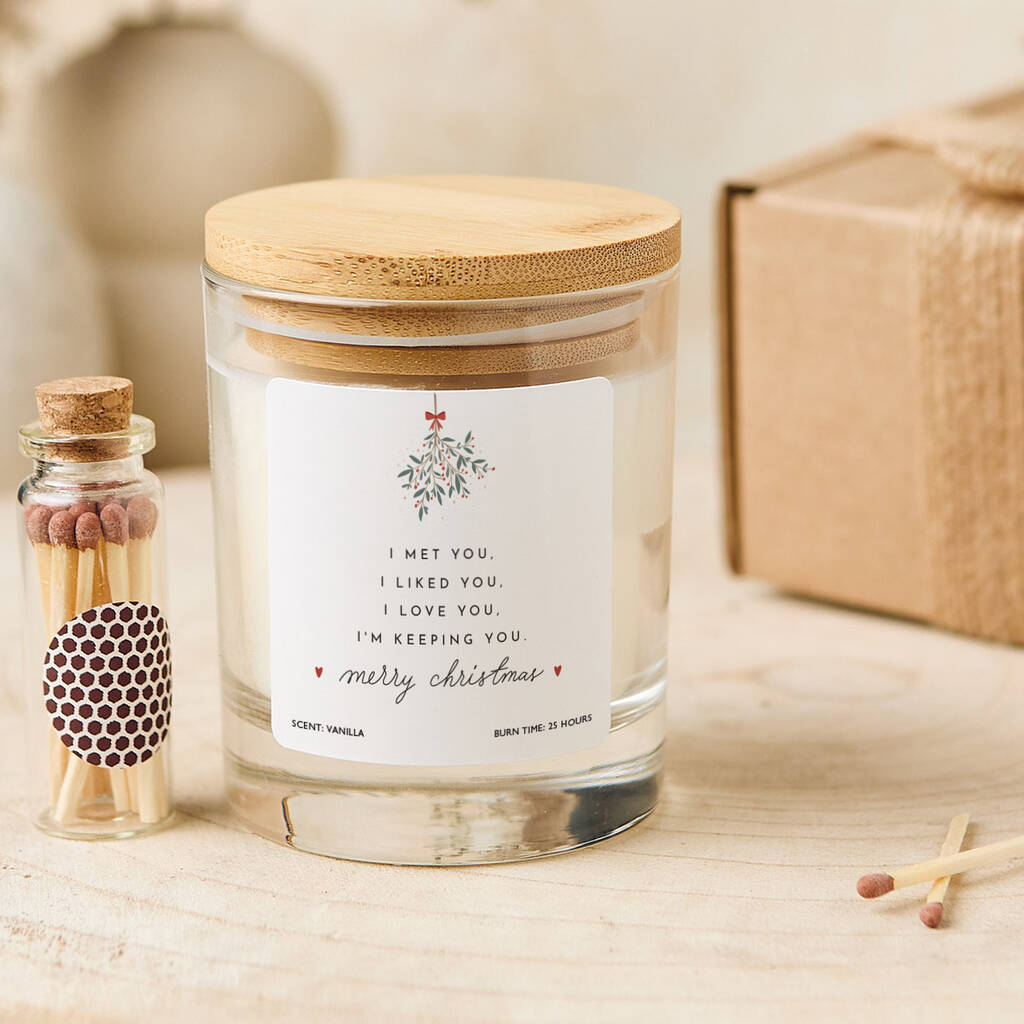 Share your love this festive season with this romantic Christmas candle, featuring the heartfelt message: I met you, I liked you, I love you, I’m keeping you. Hand-poured with care and topped with a festive mistletoe design, it’s the perfect keepsake for your partner, boyfriend, girlfriend, or spouse. Ideal for adding warmth and romance to the holidays, this candle makes a thoughtful Christmas gift that can be treasured long after the season ends. Whether placed under the tree or given as part of a cosy night in, it’s a gift that speaks from the heart.
