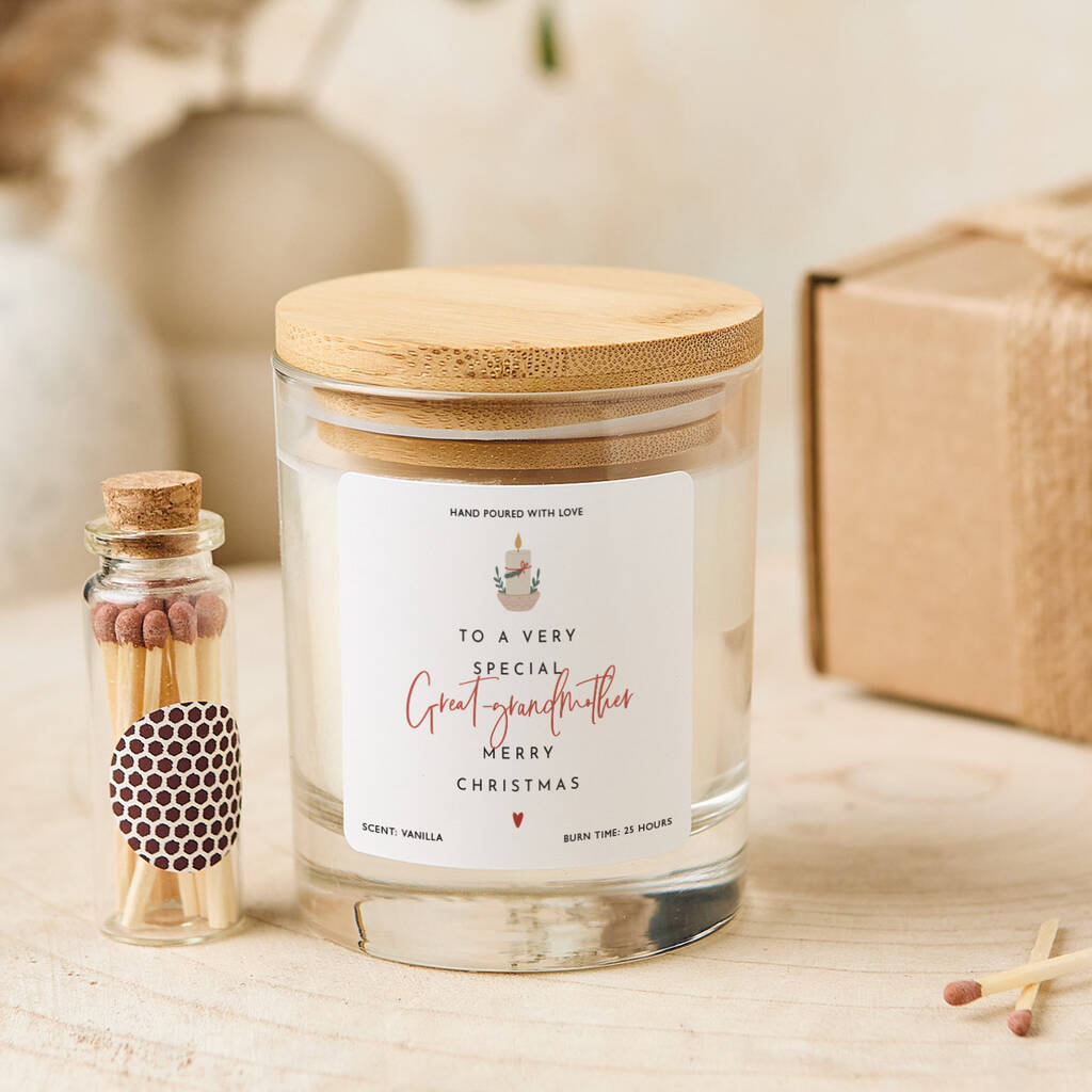 Christmas Gift for Great Grandmother Vegan Soy Wax Candle with Bamboo Lid Free Gift Package with Mini Matches Jar