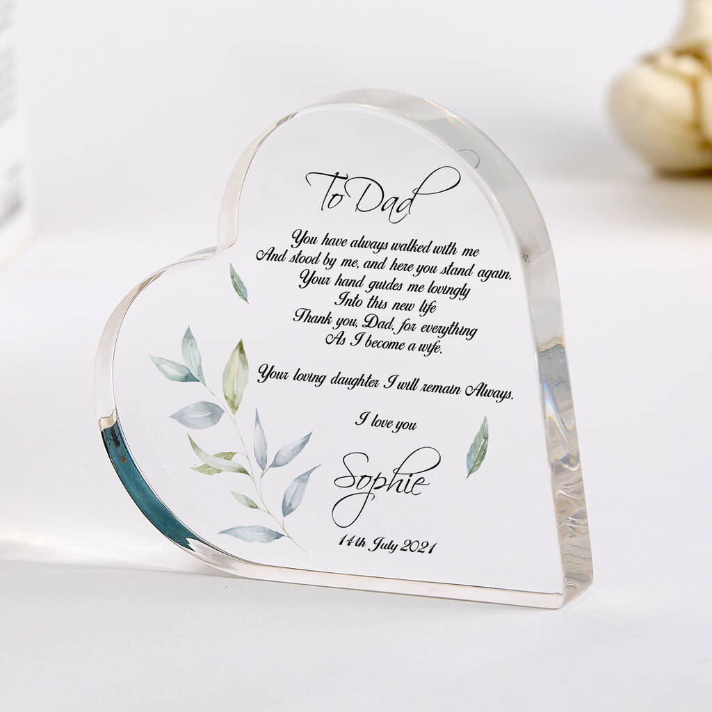 Father of the Bride Gift – Heart-Shaped Acrylic Keepsake from the BrideA heartfelt and timeless gift for your dad on your wedding day, this heart-shaped acrylic plaque is a sentimental thank-you keepsake from a daughter to her father. Featuring a touching wedding day poem or message, it’s the perfect way to show appreciation for all his love, support, and the memories you share.