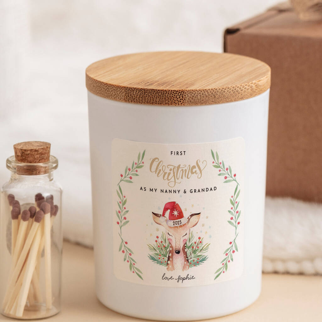 First Christmas Candle Gift for Nanny and Grandad Personalised Reindeer Design 1st Xmas Keepsake for Grandma Grandpa Nan