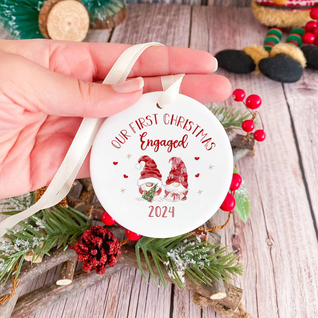 First Christmas Engaged Ceramic Ornament With Gnomes