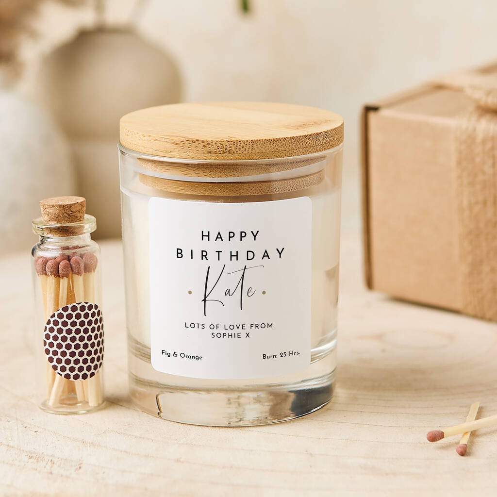 Personalised Birthday Scented Candle Gift – Custom Name & Text for Her Treat someone special to a beautifully crafted personalised scented candle, designed as a meaningful birthday keepsake. Customised with the recipient’s name and your personal message, this elegant candle comes in a clear glass jar with a natural wooden (bamboo) lid, making it the perfect gift for a best friend, sister, mum, nanny, or loved one. A lovely birthday gift set, combining pretty presentation with a personal touch – perfect for milestone celebrations.