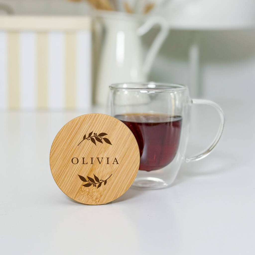 Add a personal touch to your tea or coffee moments with this beautifully designed double wall glass mug. Featuring a custom name engraved on the bamboo lid, this elegant mug is perfect for everyday use or as a special gift. The lid also functions as a handy coaster, making it both stylish and practical. A thoughtful present for birthdays, Christmas or a relaxing treat for yourself.