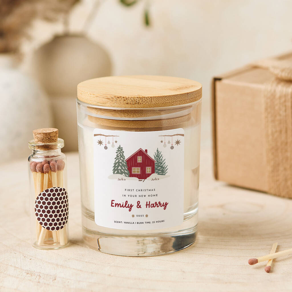 Personalised First Christmas in New Home Candle Gift Vegan Soy Wax Free Gift Package and Mini Matches Jar