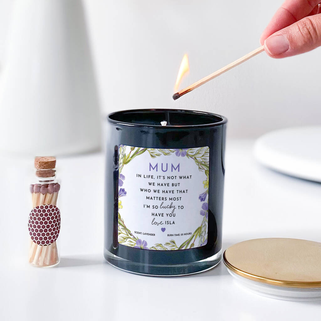 Hand-poured personalised candle with floral design, a thoughtful gift for Mum to show love and gratitude on birthdays, Mother’s Day, or special occasions.