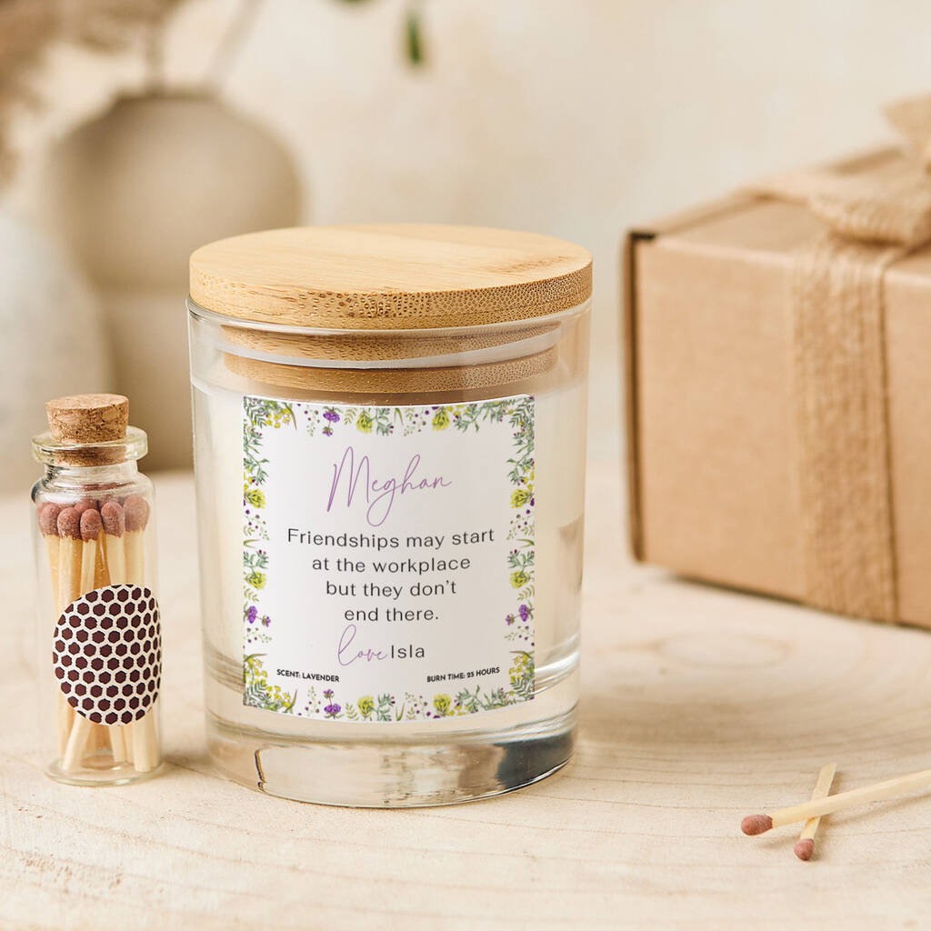 Hand-poured personalised soy wax candle with floral design. A thoughtful keepsake gift to celebrate workplace friendships that last beyond the office.