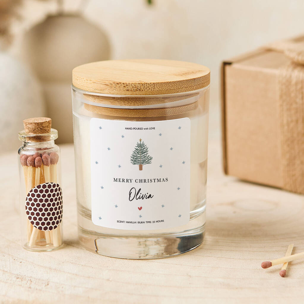 Celebrate the magic of Christmas with this beautifully personalised festive candle, featuring a charming tree and star design alongside your chosen name. Hand-poured with care, this elegant keepsake makes a heartfelt gift for friends, family members, or someone special during the holiday season. Perfect for creating a cosy festive atmosphere, it’s an ideal choice for Secret Santa, stocking fillers, or as part of a thoughtful Christmas gift set. Its timeless design ensures it can be treasured and displayed year after year.
