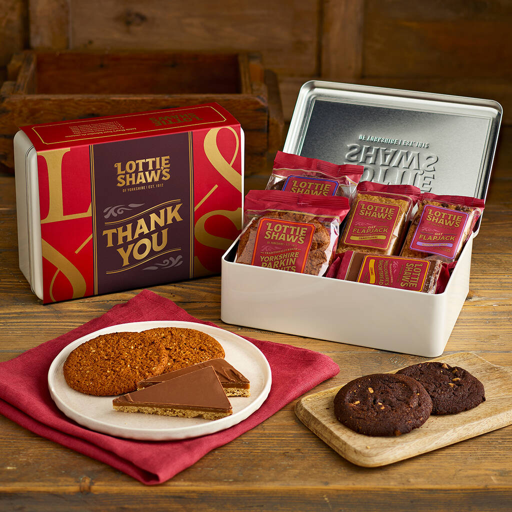 Our fabulous tin with a Thank You sleeve is filled with our award winning biscuits, flapjacks and millionaire shortbreads baked in our family bakery