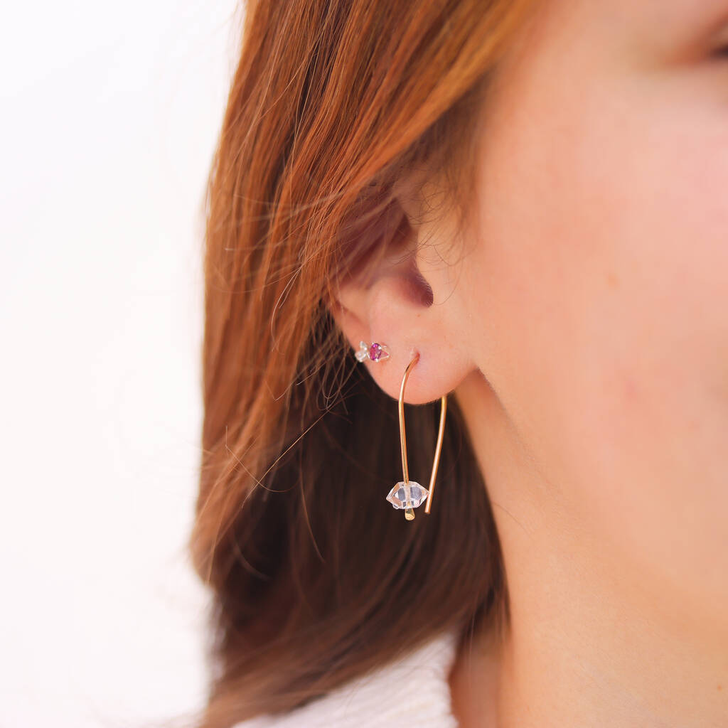 These herkimer diamond earrings are simple, minimalist drop earrings that feature a single Herkimer diamond at the end of a long open earring.The quality of the stones is remarkably stunning - they are so clear, bright and beautiful. The stones are held up by a simple hammered end of the earring, and the rest of the earwire loops up and back through your ears.