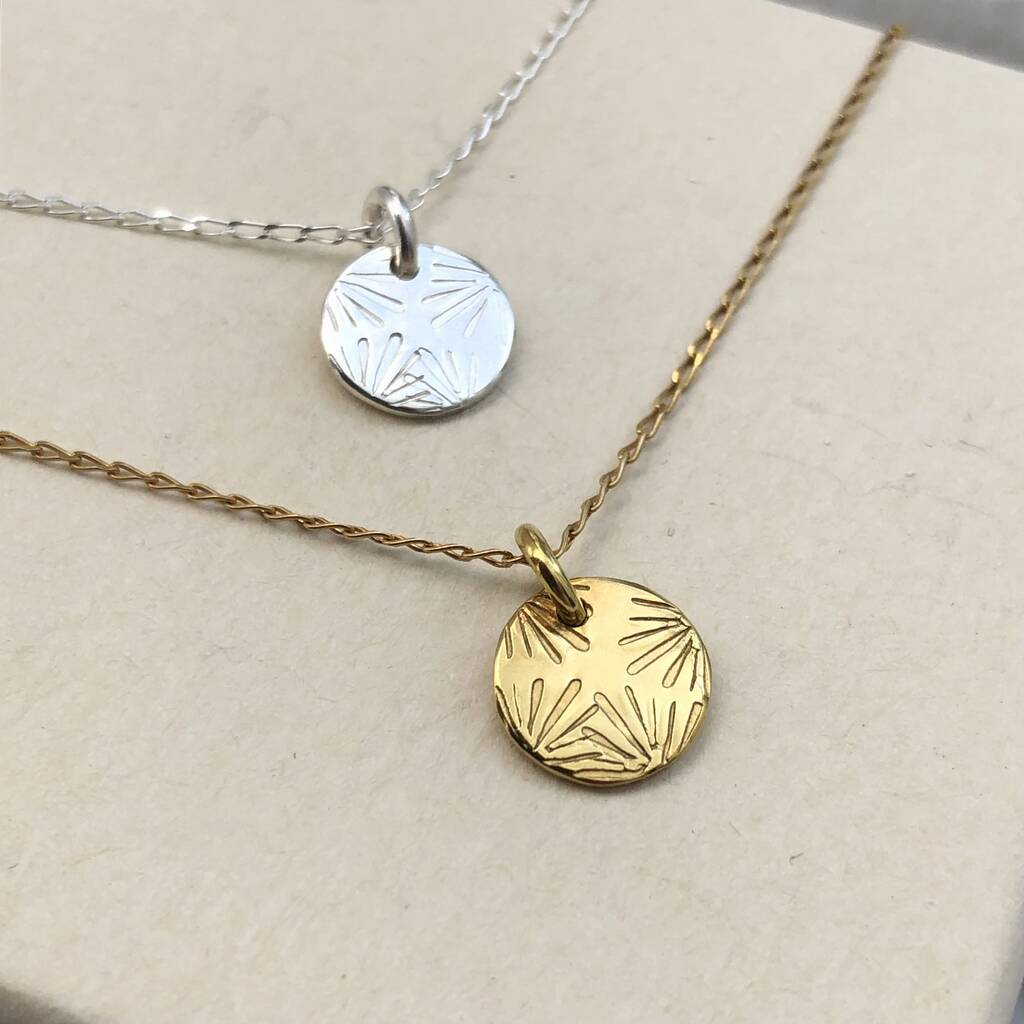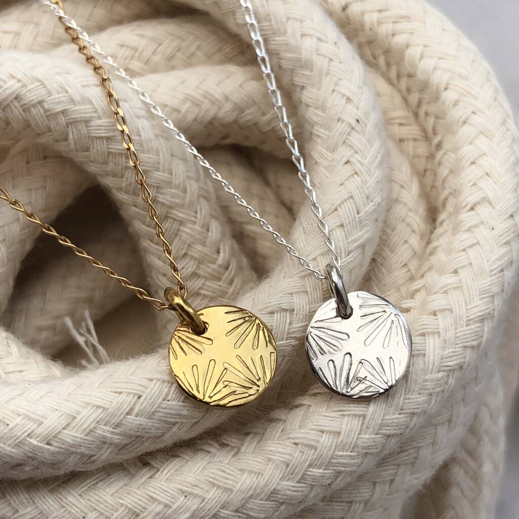 Lovingly handmade from recycled silver or gold vermeil, this delicate sunburst pendant captures light and meaning in equal measure.A delicate take on our original design, the Mini Sunbeam Necklace features a hand-embossed disc that catches the light with every movement. Lovingly handcrafted from recycled sterling silver or gold vermeil, its subtle sunburst texture makes it the perfect piece to wear every day — beautiful worn alone or layered with your favourites. A thoughtful gift that’s timeless, elegant, and full of meaning.