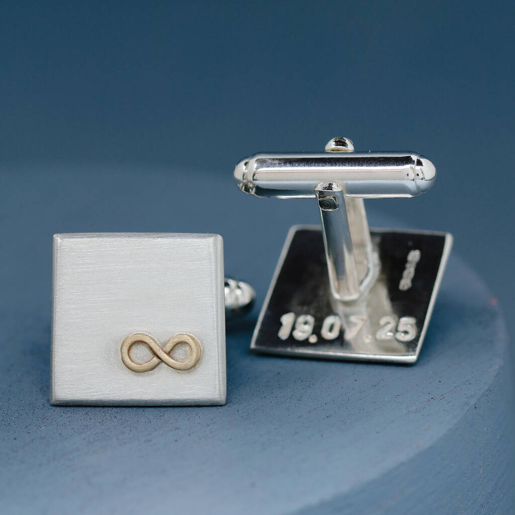 Handcrafted sterling silver cufflinks with a 9ct gold infinity symbol, personalised with a hidden message—perfect as a husband anniversary gift or meaningful personalised wedding cufflinks.Celebrate everlasting love with these personalised sterling silver cufflinks, each detailed with a solid 9ct gold infinity symbol. Representing eternal connection and commitment, they make a meaningful husband anniversary gift or groom wedding accessory. Add a hidden hand-stamped message on the reverse for a personal touch he’ll treasure. Designed to be both stylish and sentimental, these cufflinks are perfect for everyday wear or special occasions. A timeless combination of silver and gold, they offer understated elegance with deep emotional meaning.
