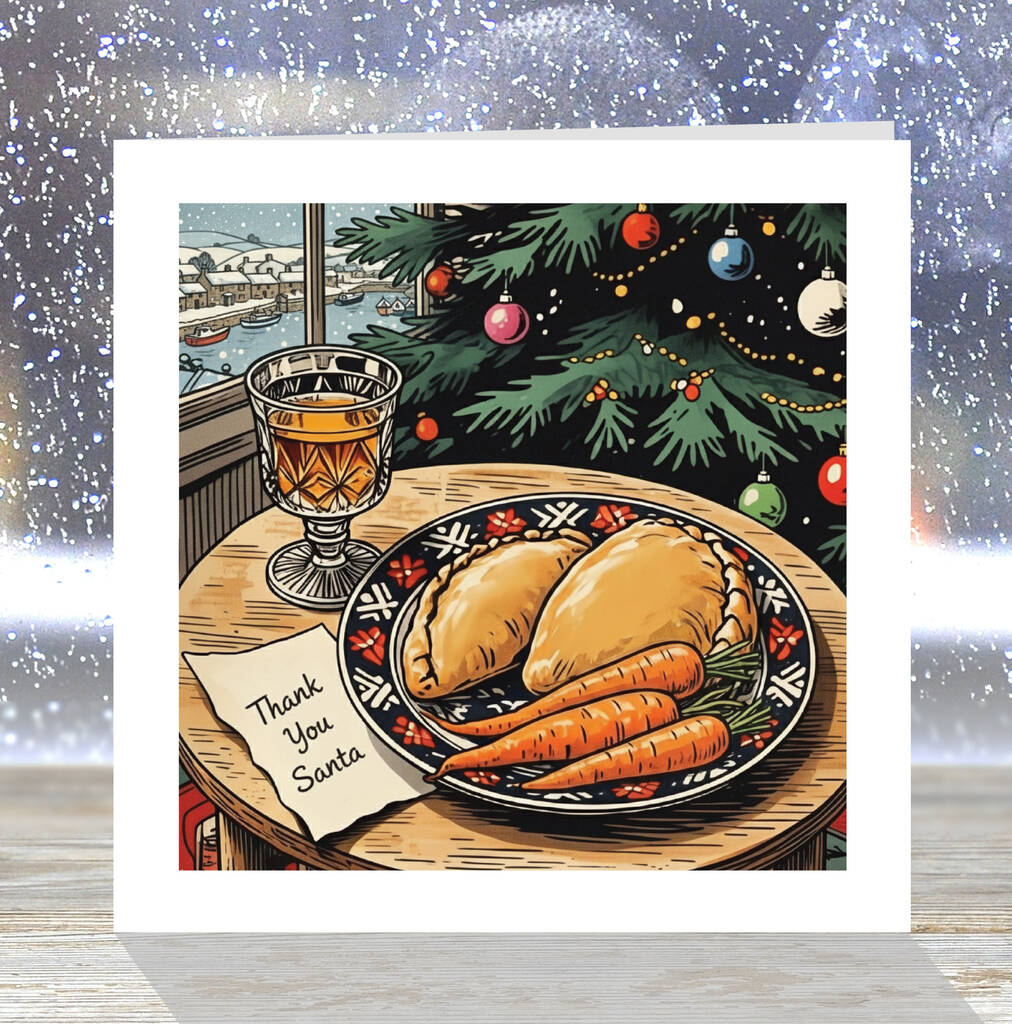 It's a heartwarming, humorous, and quintessentially Cornish scene that is perfect for anyone who loves Cornwall, appreciates a good pasty, or is simply looking for a holiday card that stands out from the rest. Share the spirit of the sea, the mines, and a good hearty meal this Christmas!