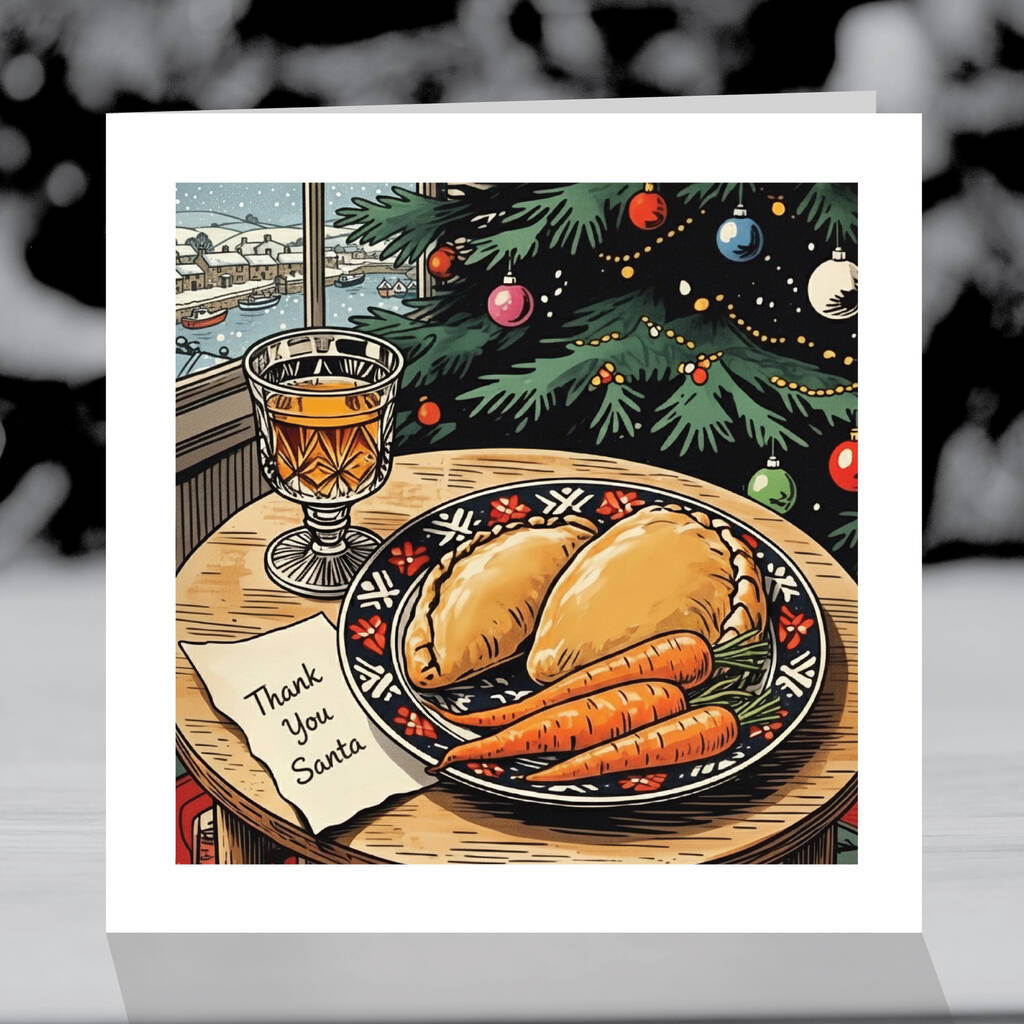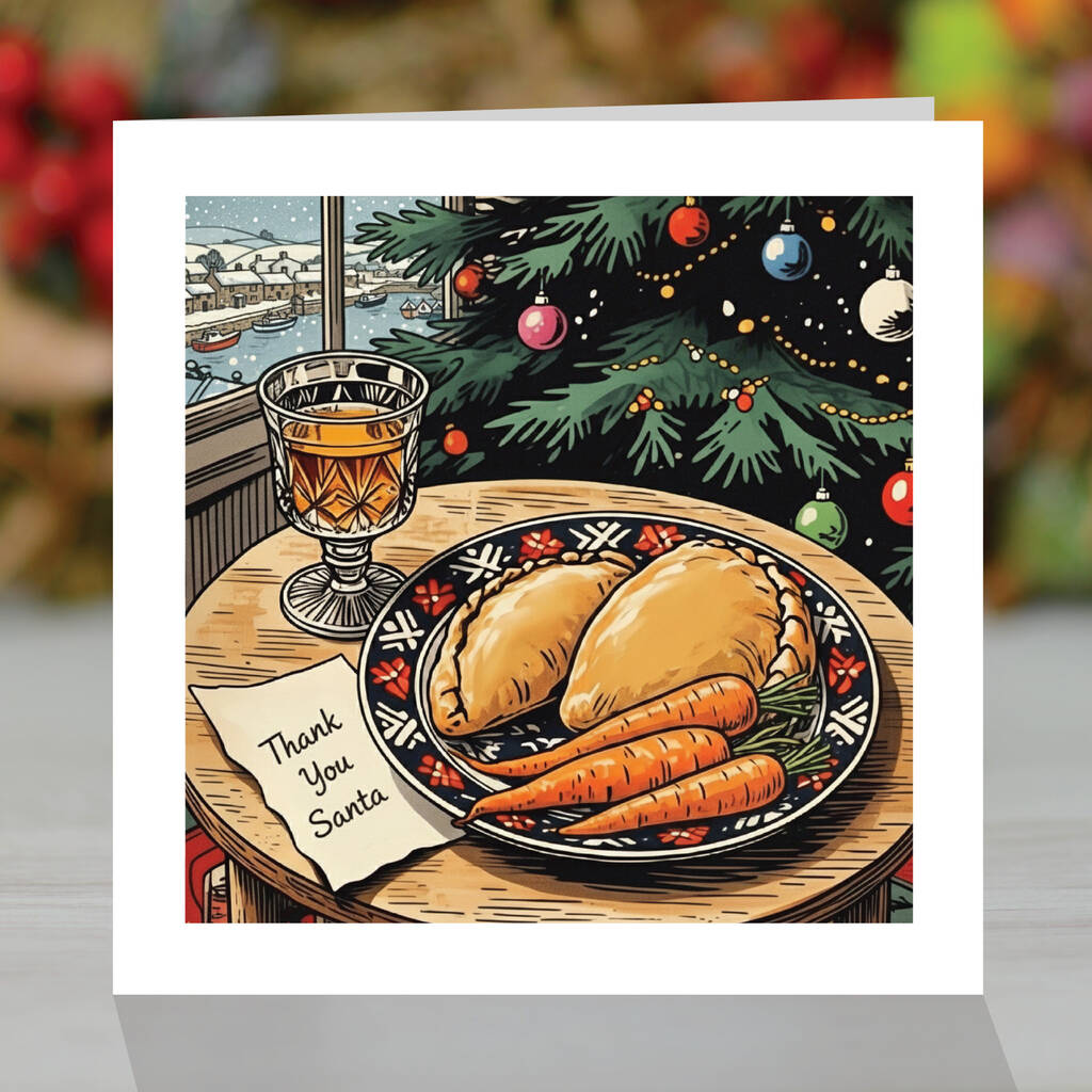 This Christmas, give the gift of unique festive cheer with a card that captures a truly Kernow (Cornish) Christmas Eve tradition! Forget the standard mince pie and glass of milk—in this cozy Cornish home, Santa and his hardworking reindeer are treated to a plate piled high with local comfort.