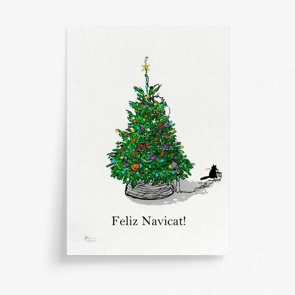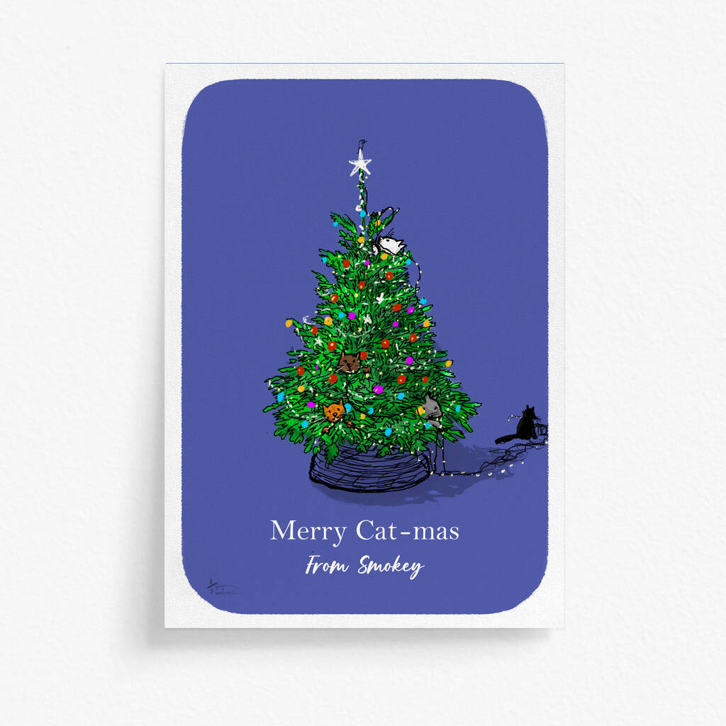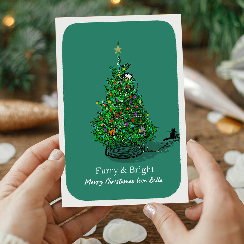 Fun and cheerful hand drawn illustration of cats playing with the Christmas decorations and hiding in the tree Christmas card personalised with any message.