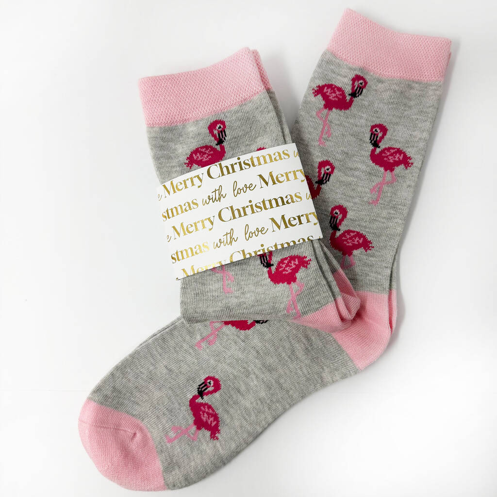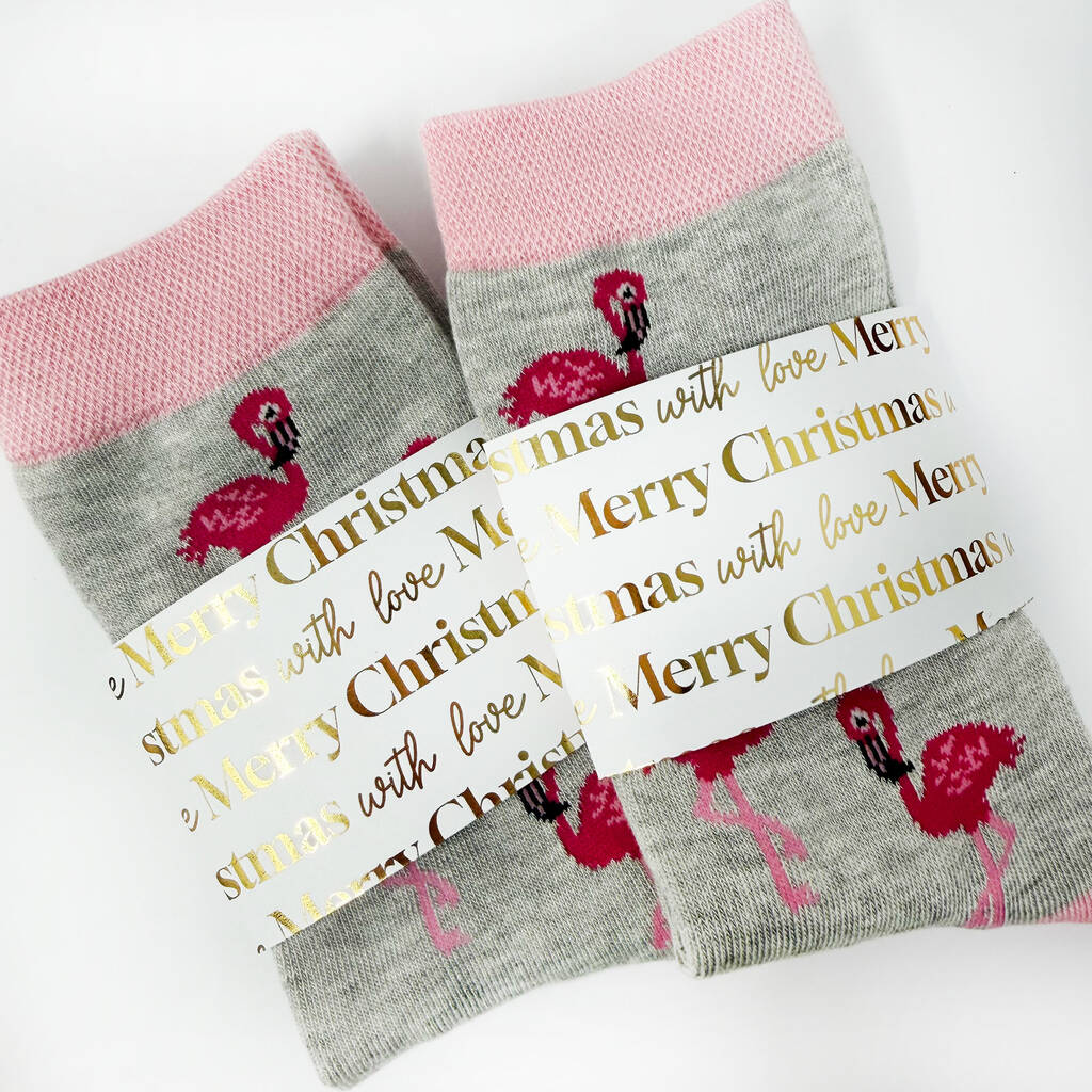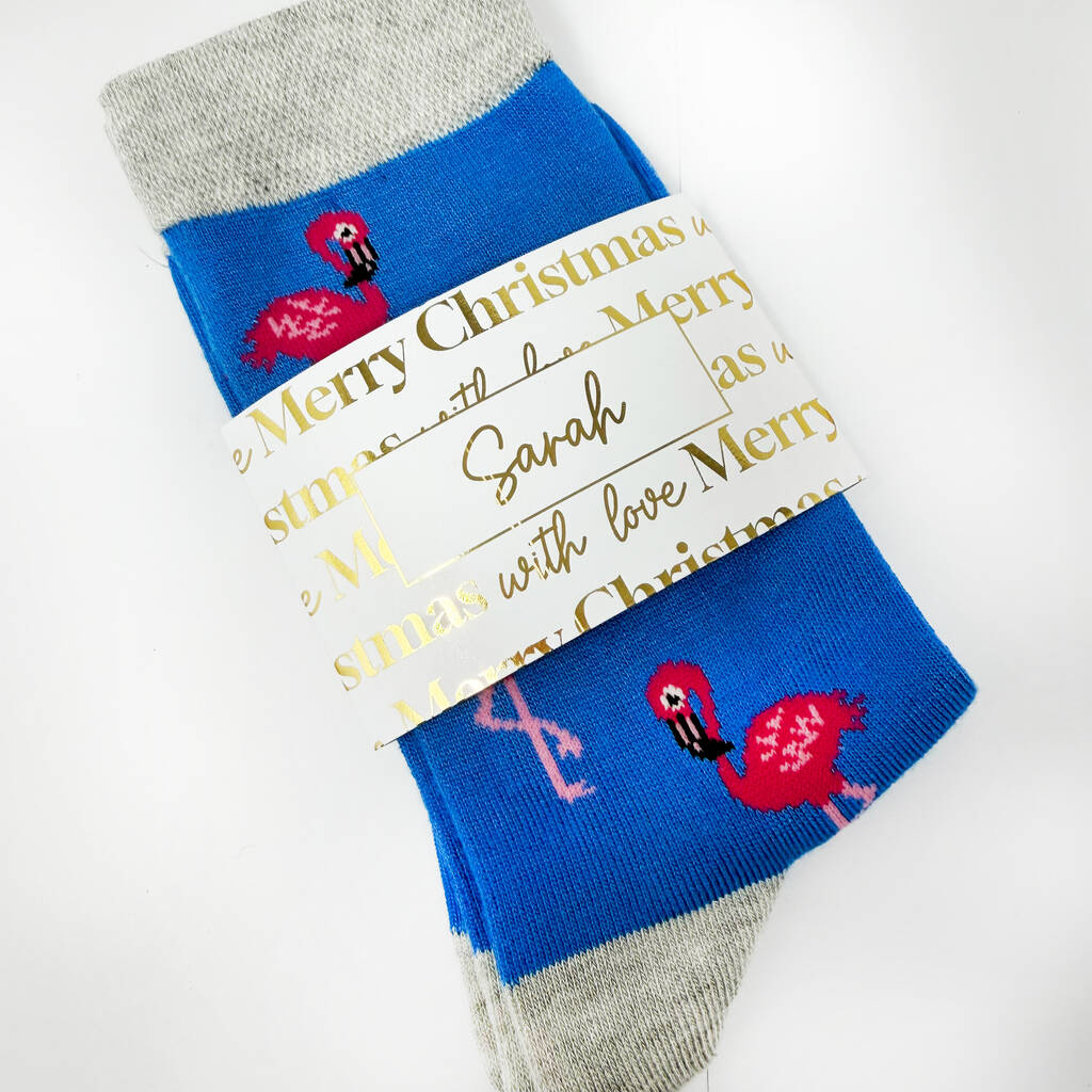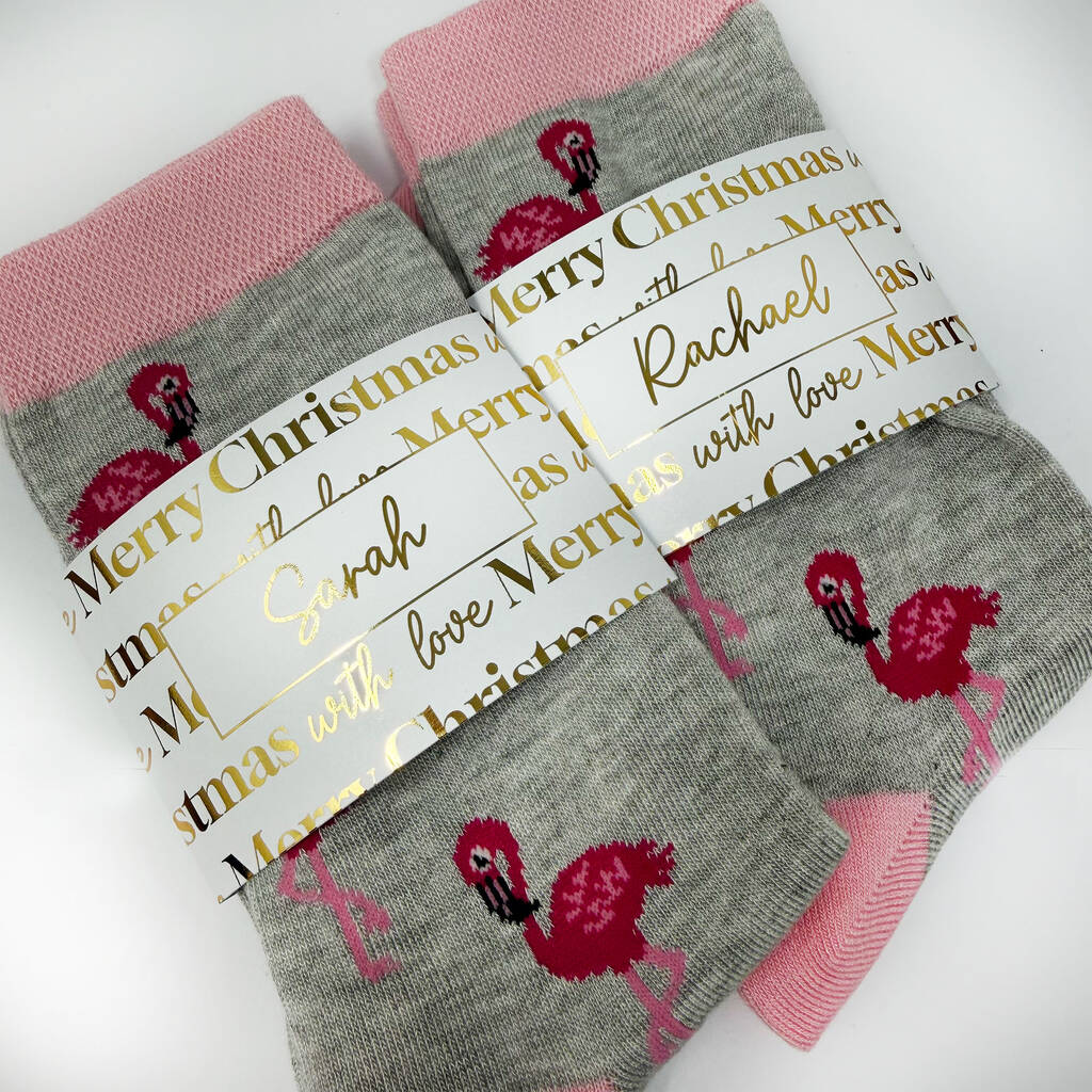 Personalised Christmas Flamingo Bamboo Socks With Gold Foil Label