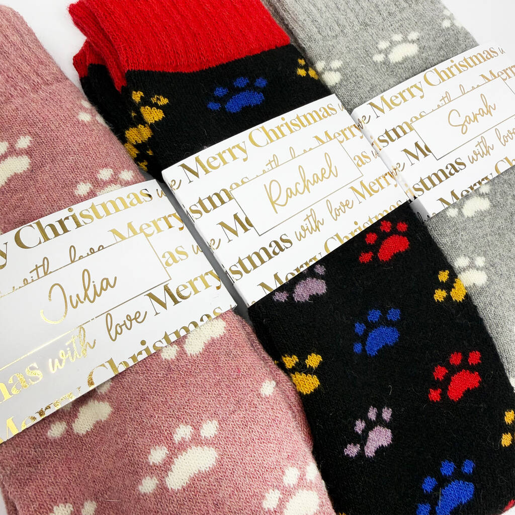 Personalised Christmas Paw Print Welly Socks With Gold Foil Label