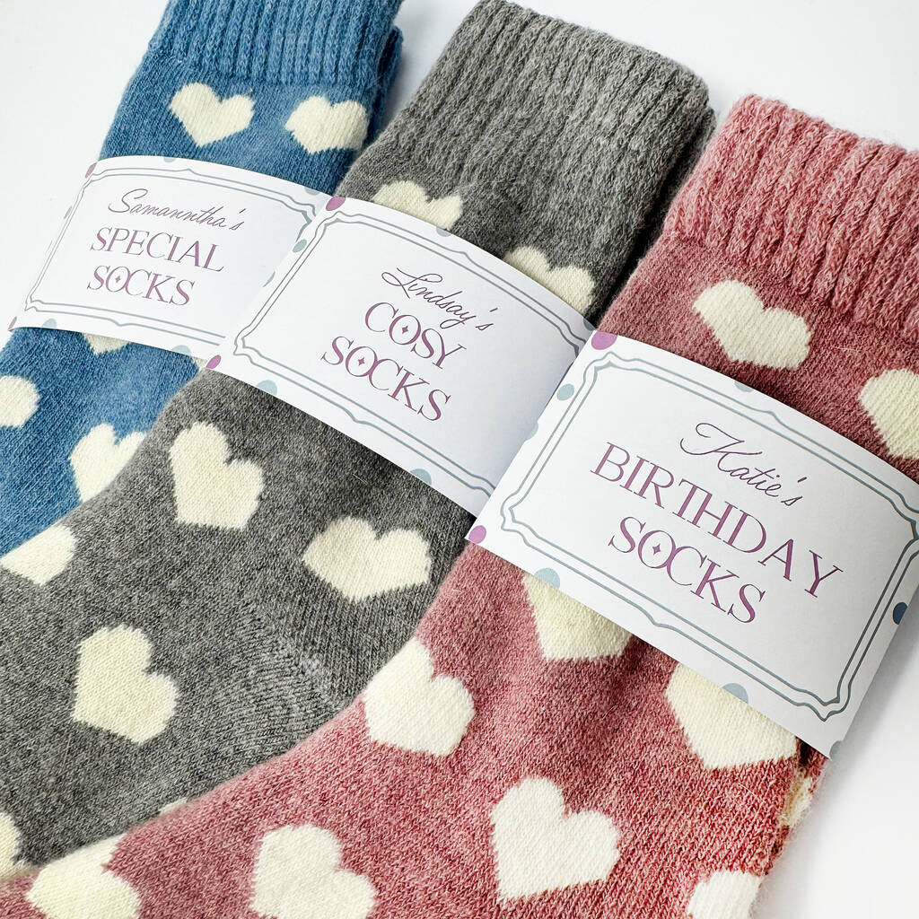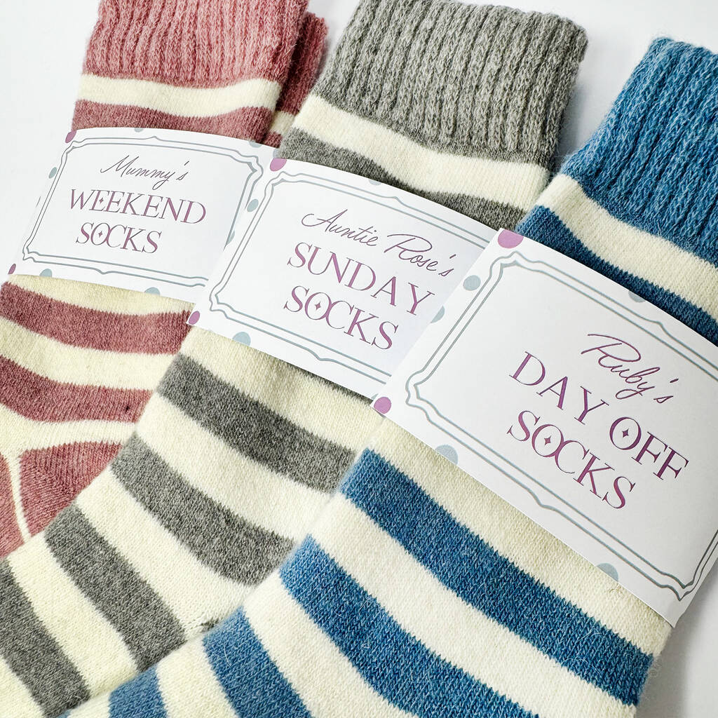 Each pair comes wrapped with a label that can be customised with your chosen name and fun sock occasion. E.g: 'Emma's Sleepover Socks'