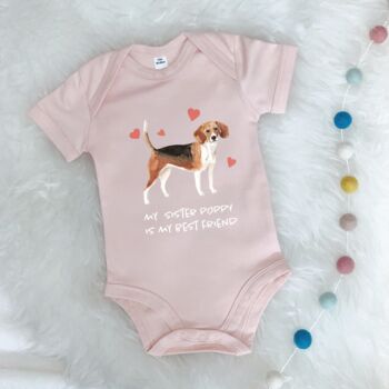 If your Beagle dog has a new sibling, this super cute babygrow is perfect including the fur baby into the newborns life. Your little ones first best friend will be their brother or sister, this also includes the dog, right? This item can be personalised with either brother or sister and the dog's name to make it even more special.