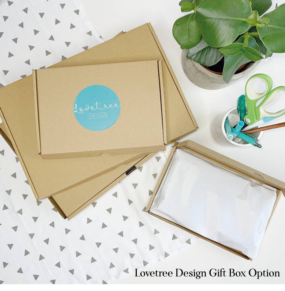 Hand printed with love and care by Lovetree Design in our studio in the West Midlands. Every item is quality checked before being dispatched. Items are sent out in packaging which is recyclable to be kind to our environment.