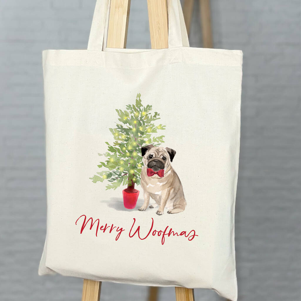 Merry Woofmas! Our Pug Dog Christmas Tote Bag is the perfect Christmas accessory or christmas gift for someone who owns a Pug.
