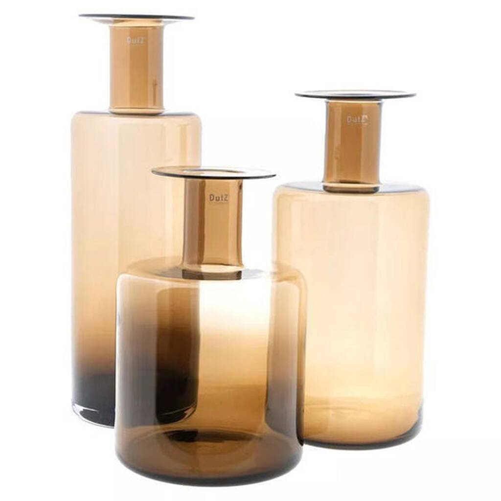 Mouth blown bottle vase crafted from rich, heavy, luxurious glass; thick European glass, a refined statement piece for elegant interior floral styling decor.The Bottle Vase Large is an original DutZ design with a decorative, timeless look that suits both classical and modern interiors. It is mouth-blown and handmade in European glass studios by master glassblowers using traditional techniques. Natural variations such as tiny bubbles or subtle differences in shape enrich each piece. The vase is made from rich, heavy, luxurious glass, usually around 3 mm thick, with color mixed inside the glass for durability and an elegant, high-quality appearance. Its impressive proportions make it ideal for centerpieces, enhancing tables, consoles, and display spaces in refined interior settings worldwide.