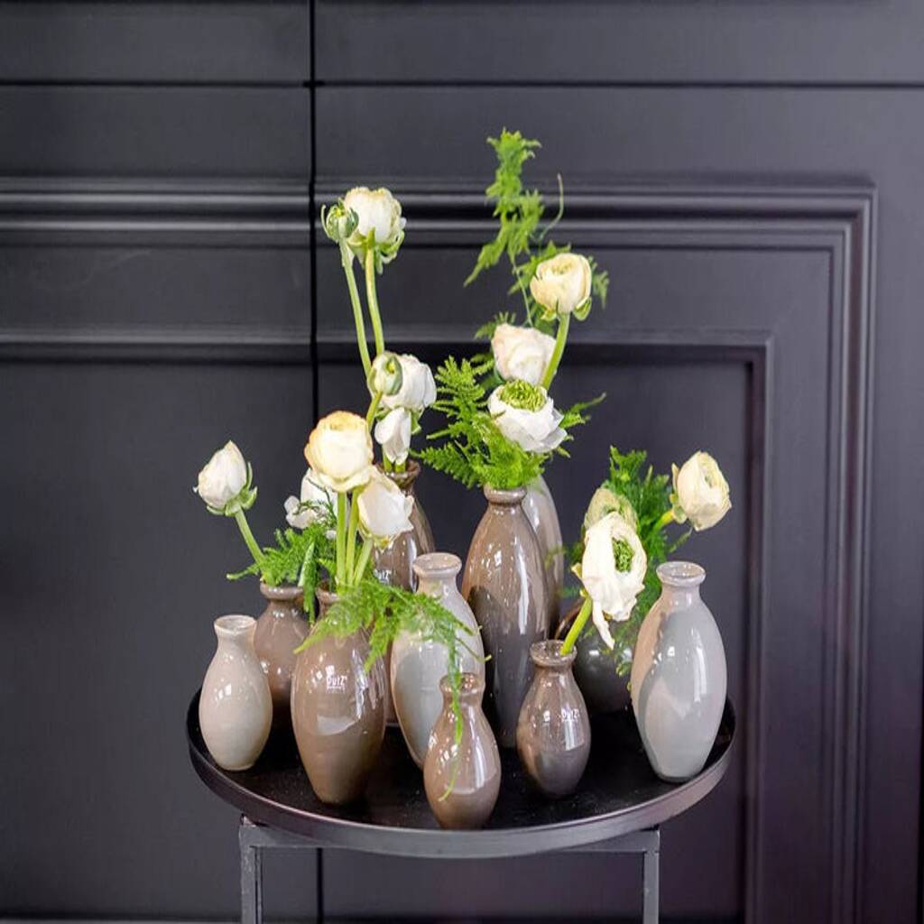 A refined set of mouth-blown vases crafted from rich, heavy, luxurious glass and thick European glass, offering timeless shapes, varied heights, and elegant variations.This set of twenty-four DutZ bud vases features four classic designs in six colour variations, allowing effortless styling across different spaces. Each piece is mouth blown by European master glassblowers, resulting in subtle differences in shape, hue, and dimension that enhance the individuality of every vase. These rich, heavy, luxurious glass pieces reflect traditional craftsmanship, with colour integrated into the glass rather than applied externally. Their varied heights create dynamic arrangements for tablescapes, shelves, or bedside displays. Distinguished by timeless design and artisanal quality, this collection embodies the distinctive elegance for which DutZ is celebrated. For inspired styling and decor.