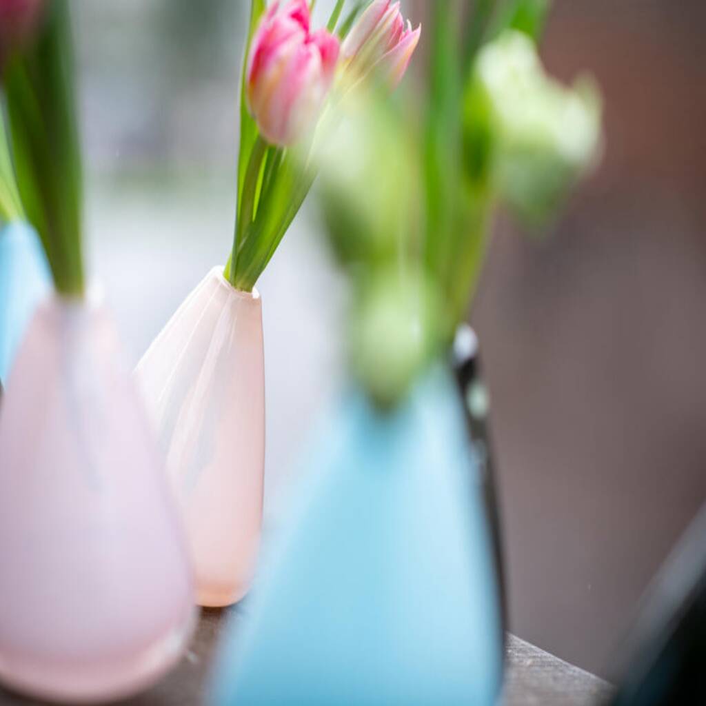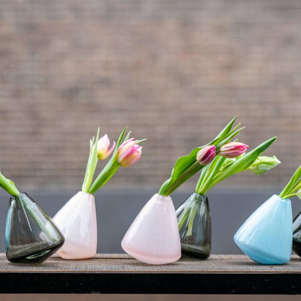 Handcrafted from rich, heavy, luxurious thick European glass, this playful tumbling vase wiggles charmingly, adding colour, movement, fun to floral displays and creative interior styling.The Tumbling Vase is a playful and colourful design featuring a rounded bottom that allows it to wiggle gently when nudged. Perfect for a single stem or just a few flowers, it brings fun and movement to outdoor summer tables or elegant evening table settings. Each vase is mouth blown by European master glassblowers, ensuring unique variations that highlight authentic craftsmanship. Made from rich, heavy, luxurious thick European glass, it combines durability with artistic charm. These vibrant vases are ideal for gifting, and mixing colours creates an even more lively and joyful display suited for any modern or creative interior.